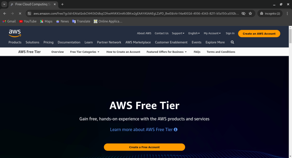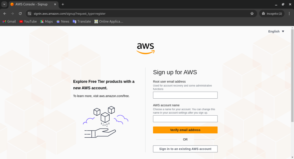 if you closely look on the site there is a button named as "Create a Free Account" in a yellow color format. Just click on that button it will navigate you a page where you will create your aws account. The page will look like this: